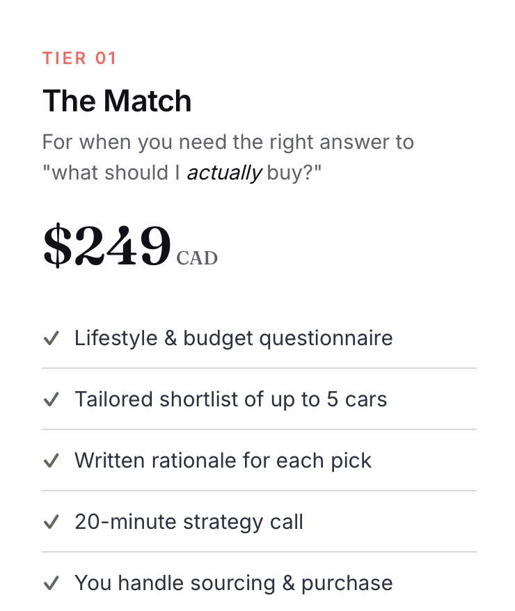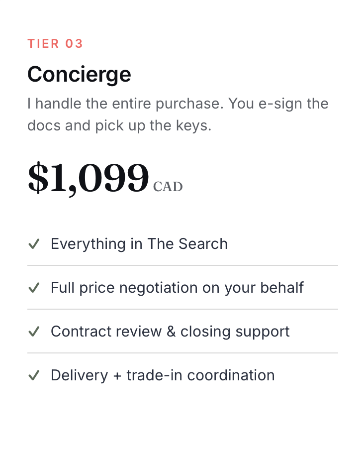 I'm David, Canada's Car Matchmaker. Whether you're just starting your search or you've already found the car and want an expert in your corner before you sign — I help Canadians walk in prepared, protected, and in control of the deal.
